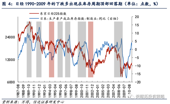 (2)日本失去30年期间库存周期对股市的影响节奏。日本1990年房地产见顶后,长期面临资产负债表衰退等风险,导致日经指数1990-2009年不断创新低。而如果对比库存周期和日经225指数,能够发现,1990-2009年,日本的产成品库存依然是周期性波动的,而且对股市影响很大。股市大部分下跌波段均出现在产成品库存见顶到回落中期,产成品库存下降末期到回升初期,股市大多能出现不错的反弹。
