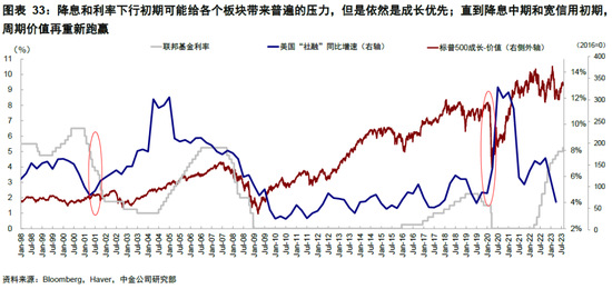 2)成长依然优先,价值周期仍待时日。当前从经济环节周期和货币信用周期看,都仍是成长风格主导,更何况纳斯达克指盈利已经提前下调充分。即便估值和预期偏高会带来调整,但相比盈利仍在下调的周期和价值板块,依然占据优势。降息和利率下行初期(意味着增长或其他压力变化)可能给各个板块带来普遍的压力,但是依然是成长优先,直到降息中期和宽信用初期,周期价值再重新跑赢。