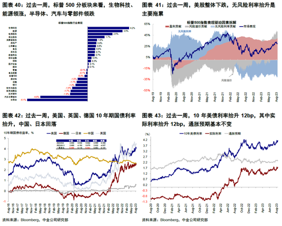 3)利率和黄金都需要等待时间。我们预计美债短期中枢3.8%附近,当前已经超调。加息概率下降会约束利率上行空间,但增长短期还有韧性降息预期难以打开,形成“下有底上有顶”的局面,四季度可能有更快下行空间;黄金更大涨幅阶段同样在四季度,三季度经济韧性或不支持黄金进一步上涨,我们按1%左右实际利率和100~105区间美元判断,黄金中枢价格四季度可能在1900美元/盎司左右。