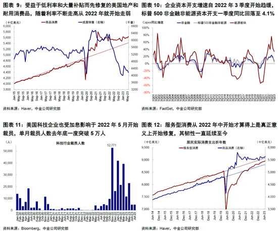 但除此之外,本轮美国经济还有一个与往常非常不同的特点,就是“时间上”的明显错位。与去年供需两端“空间上”的错位不同(需求强而供给受限,导致运价飙涨,库存不足),美国经济走到当前位置呈现出各个环节之间明显的“时间上”的错位,体现在:1)疫情后受益于低利率和大量补贴而先修复的美国地产和耐用消费品环节,随着利率不断走高从2022年就开始走弱;2)受整体需求和对利率变化更敏感的企业资本开支和科技行业也在2022年已经大幅下行,科技企业大规模裁员也是一个直接体现;3)相反,受疫情阻断的场景式的服务型消费,从2022年中开始才算得上是真正意义上开始修复,其韧性一直延续至今。