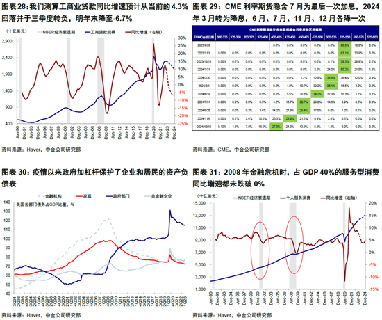 ►程度上不到衰退。紧信用力度有限、紧货币接近尾声、各个部门资产负债表健康、以及“滚动或交替式放缓”恰恰降低了程度较深衰退的可能性。举例而言,2008年金融危机时,占GDP 40%的服务型消费同比增速都未跌破0%,因此我们预期本轮周期会大幅下滑也是不现实的。