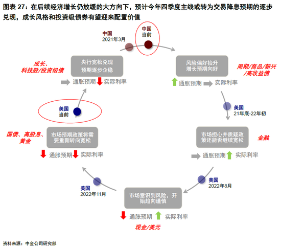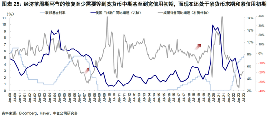 经济前周期环节的修复至少需要等到宽货币中期甚至到宽信用初期,而现在还处于紧货币末期和紧信用初期。退一步讲,如果地产周期和投资周期比我们预想的更为强劲,完全抵消服务消费放缓推动增长上行,那也就意味着通胀回落和美联储加息停止还远未结束,进而会反作用于增长,因此逻辑上也不自洽。