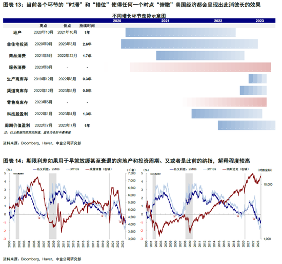 与正常周期中各个环节基本同步变动、好与不好一目了然有很大不同,当前各个环节的“时滞”和“错位”使得任何一个时点“俯瞰”美国经济都会呈现出此消彼长的效果。因此,考虑到美国经济各个环节类似正弦波一样“滚动或交替”下滑,我们认为没有必要过于纠结整体经济是否“衰退”,过于关注整体反而会漏掉结构上错位的机会,例如一些看似失效的领先指标如期限利差倒挂,如果对比早就放缓甚至轻度衰退的房地产和投资周期,也就能解释得通了。