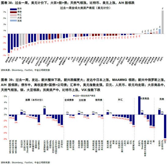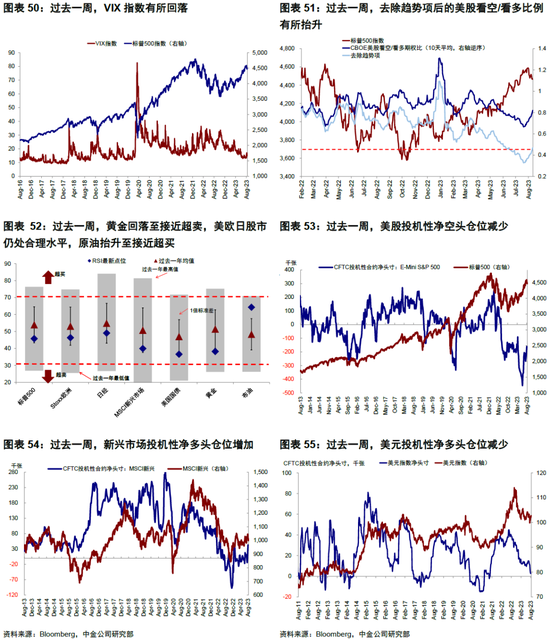 ►情绪仓位:全球各主要市场均处于合理区间。过去一周,超买超卖程度上,黄金回落至接近超卖,美欧日股市仍处合理水平,原油抬升至接近超买。投机性仓位方面,美股投机性净空头仓位减少,新兴市场投机性净多头仓位增加,美元投机性净多头仓位减少,铜期货投机性仓位由净多头转为净空头。