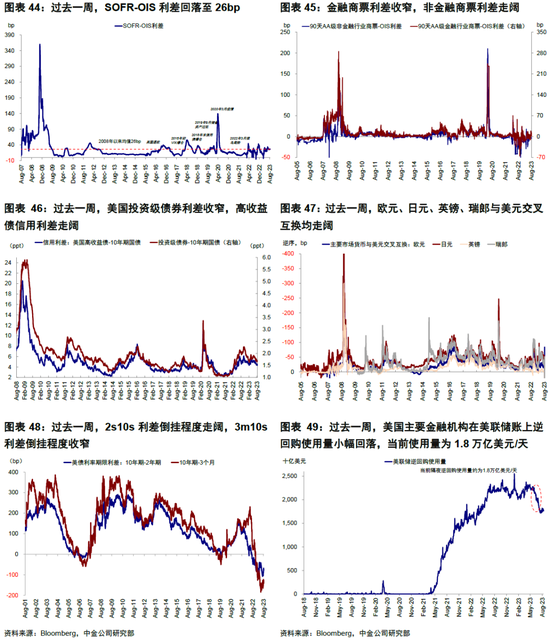 ►流动性:在岸美元流动性有所放松。过去一周,SOFR-OIS利差回落至26bp,美国投资级债券信用利差收窄;衡量离岸美元流动性的指标上,欧元、日元、英镑、瑞郎与美元交叉互换均走阔。美国主要金融机构在美联储账上逆回购使用量小幅回落,当前使用量为1.8万亿美元/天。