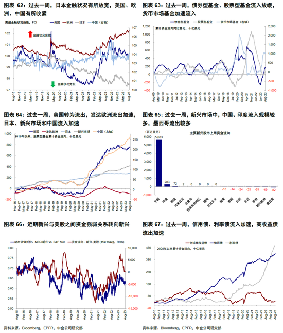 ►资金流向:货币基金流入加速,高收益债流出加速。过去一周,债券型基金、股票型基金流入放缓,货币市场基金流入加速。分市场看,各主要市场股市中,美国转为流出,发达欧洲流出加速,日本、新兴市场和中国流入加速。