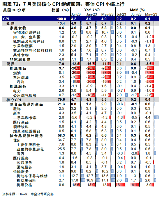 ►基本面与政策:7月美国核心CPI继续回落、整体CPI小幅上行。7月美国整体CPI同比升至3.2%(上个月3%),低于市场预期(3.3%);环比0.2%,符合市场预期(0.2%)。核心CPI同比降至4.7%(上个月4.8%),符合市场预期;环比0.2%(市场预期0.2%)。核心CPI环比两个月为0.16%,较过去明显下台阶。分项看主要是商品价格跌幅扩大,如二手车。但服务降幅有限。酒店、机票价格环比连续两个月为负,但等量房租略有抬升,其他分项也有走高,使得超级核心通胀还有韧性。往后看,我们预计三季度核心CPI或仍将快速下行(预计9月回到3.5%附近),意味着美联储进一步加息必要性下降。四季度后下行空间有限、甚至还会小幅翘尾;这个数据由于变化不大、整体抬升核心下降有限,所以对资产和加息预期的方向影响都有限;美债上有顶(4%左右),但下行空间短期也打不开(3.8%)。