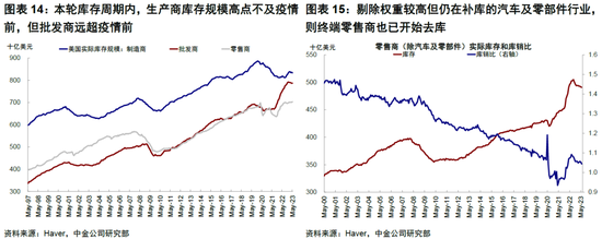 1)库存周期:疫情期间因为生产、渠道和消费的差异,美国这三个环节的库存就出现明显的错位,与以往历次周期都明显不同。从实际库存规模角度看,美国生产与渠道库存已见顶回落,生产商并未回补至疫情前水平,但渠道商远超疫情前。终端零售商结构性差异明显,若剔除权重较高但仍在补库的汽车及零部件行业,则终端零售商也已开始去库。