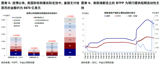 众所周知,总量上美国财政大规模刺激保护了居民(对居民直接补贴规模8670亿美元,相当于美国GDP的4%)、企业(对中小企业的薪资保护计划,以及美联储疫情后直接购买企业端信用债等)、银行(美联储设立BTFP提供短期贷款和流动性支持)各部门的资产负债表不受损且还有余力大幅支出与消费,都使得本轮周期在绝对水平上就比此前周期更强。
