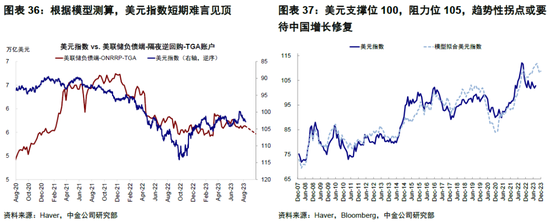 4)美元难降,趋势拐点要待中国增长修复。基准情形下虽无大涨空间,但可能维持高位一段时间。根据我们美元指数预测模型测算,美元支撑位100,阻力位105,趋势性拐点或要待中国增长修复。