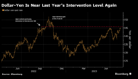 去年,日元兑美元跌向146日元时引发了日本当局干预。