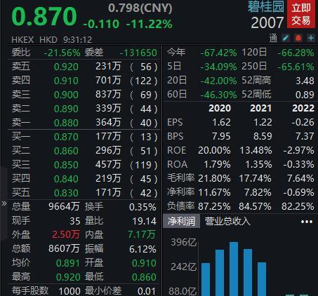 8月14日,港股碧桂园早盘大幅低开超7%,截至发稿,该股跌幅扩大至11%,报0.87港元。
