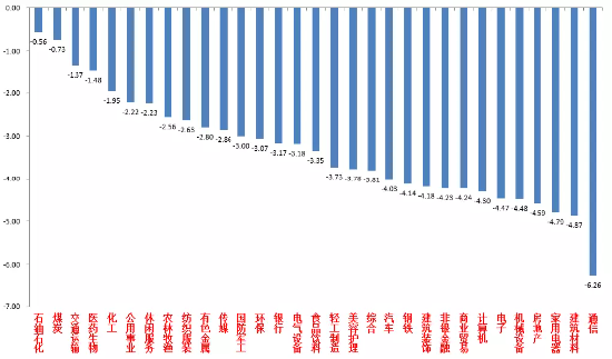 31个申万一级行业中,石油石化(-0.56%)、煤炭(-0.73%)和交通运输(-1.37)跌幅较小。