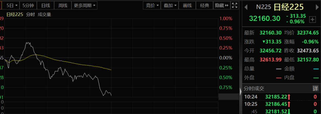 日本市场的走弱亦带动韩国股市走低,截至早盘10点30分,原本略强的韩国指数杀跌近1%。香港市场、A50期指亦跟随杀跌。