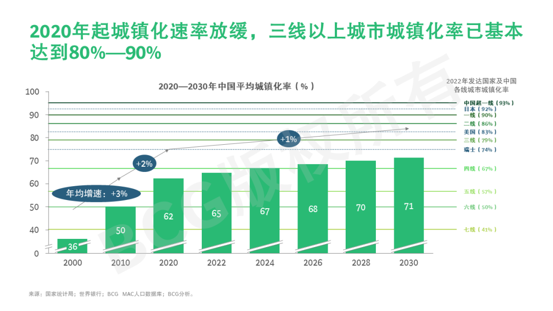 过去二十年,中国城镇化大发展,全国城镇化率从36%猛增到62%。至2022年,全国平均城镇化率已达65%,其中三线以上城市城镇化率已达80%—90%。
