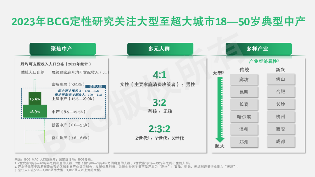我们的研究针对全国各城市群500万常住人口以上的节点城市被访者,跨XYZ三个世代。特别值得注意的是,我们关注的是典型的中产消费者,可支配收入趋同,家庭月均可随意支配收入大多在1—1.5万元人民币之间,处于家庭经济水平的同温层。