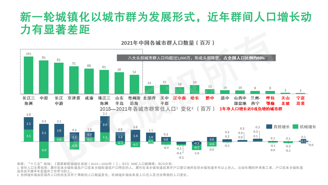 城市群的格局变化和产业造势刺激人口流动。南方城市群因为经济、气候、地理等优势,在人口增长动力方面目前更胜一筹,机械增长(流入减流出)是其中的一个重要原因。2018至2021年间,城市群间的人口机械流动规模与自然增长相比已达后者规模的35%。未来两者的消长尚待观察。可以肯定的是,产业经济和新一轮城镇化效应的叠加,已显示出对微观消费市场磁场般的影响。