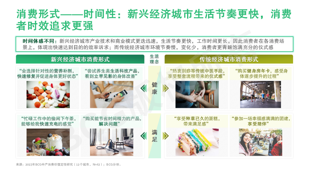 时间上:新兴经济城市产业技术和商业模式更迭迅速,生活节奏更快,工作时间更长,因此消费者在各消费场景中体现出快速达到目的的效率诉求;而传统经济城市环境节奏慢,变化少,消费者更青睐饱满充分的仪式感。