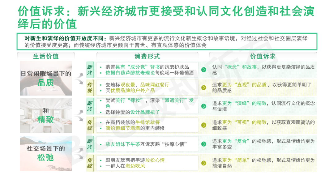 文化语境上:新兴经济城市有更多的流行文化新生概念和故事语境,对经过社会和社交圈层演绎的价值接受度更高;而传统经济城市更倾向于普世、有直观体感的价值体会。