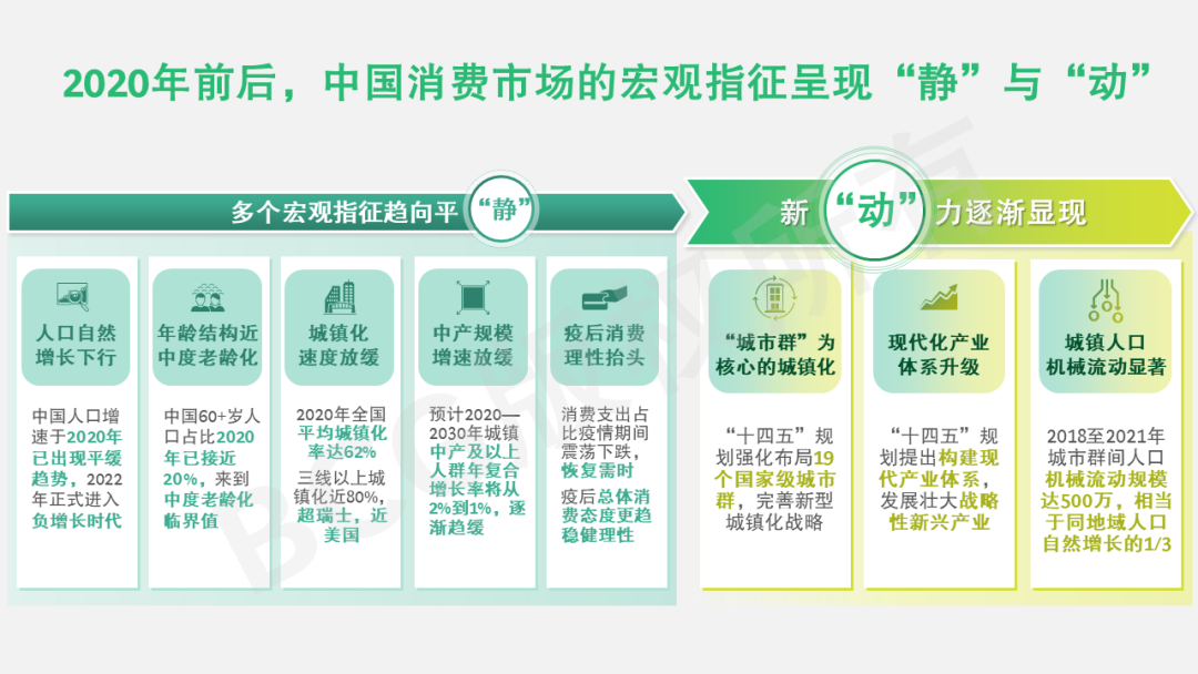 2020年前后,宏观变化累积,大趋势齐聚。在事件性层面,新冠疫情和全球政治经济变局给全球消费市场带来重大影响,促使人们重审消费态度。在结构性层面,中国人口进入负增长阶段,60岁及以上老年人占总人口比例将超过20%,到达中度老龄化起点,以城市群为形式的新一轮城镇化大幕拉开,产业调整升级,区域间人口流动显著,塑造新的经济社会微观环境。