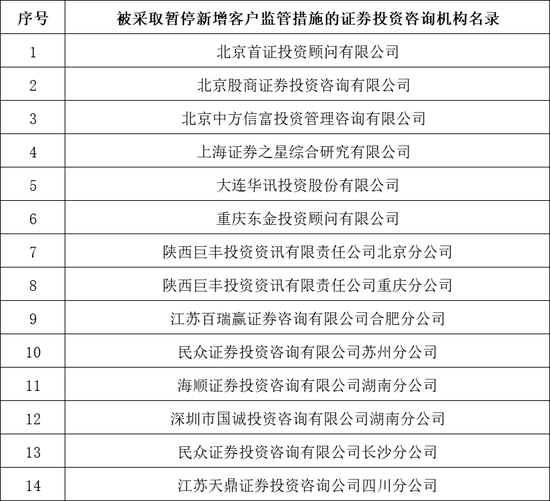 截至今年上半年末,已有14家投资咨询机构(含分支机构)被采取暂停新增客户监管措施,尚未“服刑完毕”。