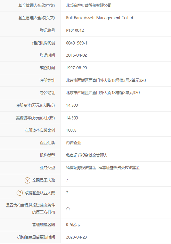 行家意外发现,北部资产在2015年4月登记备案为私募证券投资基金管理人。全部7名员工均拥有基金从业资格。不过,这家私募机构仅有一只产品,规模不足500万元。