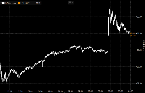 美国钢铁股价受此消息影响带动进一步飙升,收盘上涨37%,创下单日最大涨幅纪录。不过,每股31.08美元的收盘价仍低于Esmark的每股35美元报价。