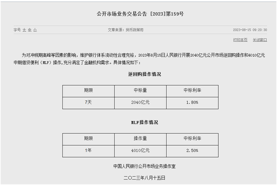 央行8月15日公告称,为对冲税期高峰等因素的影响,维护银行体系流动性合理充裕,央行开展2040亿元公开市场逆回购操作和4010亿元中期借贷便利(MLF)操作,充分满足了金融机构需求,中标利率分别为1.8%、2.5%,此前为1.9%、2.65%。这意味着,本次公开市场逆回购和MLF操作利率分别下降10个和15个基点。