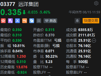 远洋集团下跌9.46%。公司预期上半年亏损约人民币170亿元至200亿元。在此之前,远洋集团曾在2022年发生上市以来的首次亏损,毛利率也创下新低。与此同时,远洋集团还濒临票据、债券双双违约的边缘。