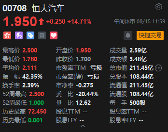 恒大汽车盘中一度涨超40%,现上涨近15%。消息面上,8月14日,恒大汽车发布公告,获得由阿联酋国家主权基金持股的上市公司纽顿集团首笔5亿美元战略投资,另有6亿人民币过渡资金将自公告后5个工作日开始陆续到账。所有战投资金全部用于恒大汽车天津工厂,确保恒驰5的正常生产和恒驰6、7的陆续量产。