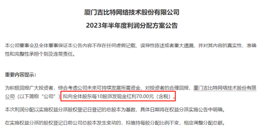 网络游戏公司吉比特公告,为积极回报广大投资者,综合考虑公司未来可持续发展所需资金、对投资者的合理回报,公司拟向全体股东每10股派发现金红利70.00元(含税)。