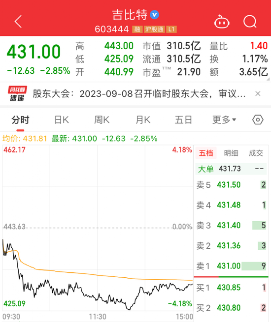 8月15日收盘,吉比特跌2.85%,收报431元,总市值310.5亿元。