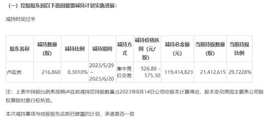吉比特表示,截至公告披露日,减持计划时间过半,公司控股股东卢竑岩通过集中竞价交易方式共减持公司股份216,860股,占公司截至2023年8月14日股本的0.3010%。本次减持计划尚未实施完毕。卢竑岩前述减持期间为2023年5月29日至2023年6月20日,减持价格区间为526.80元/股-575.30元/股,减持总金额为1.19亿元。