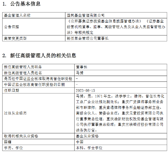 8月16日,益民基金发布高级管理人员变更公告,新任马赟为董事长,任职日期2023-08-15。