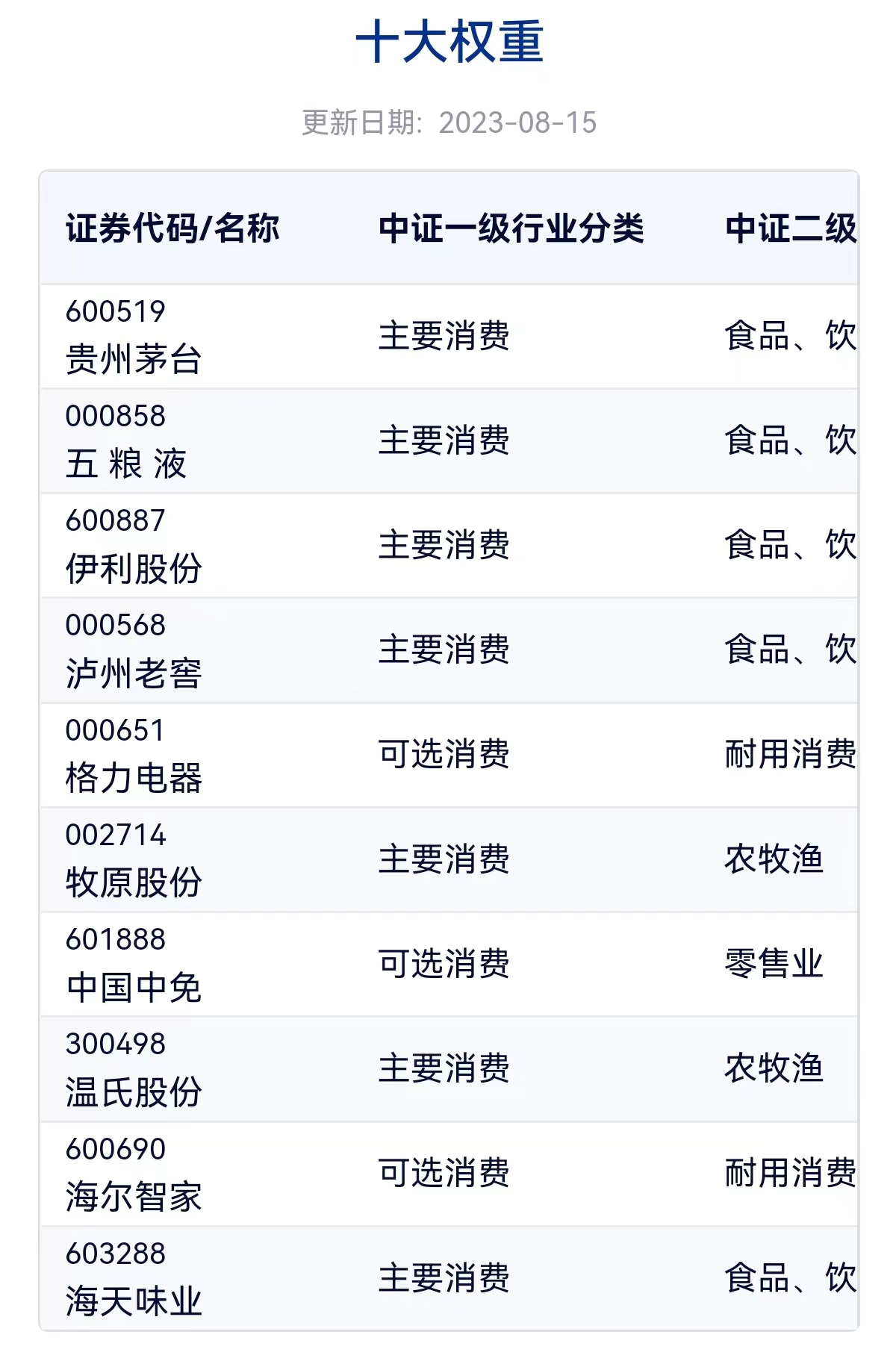 消费50ETF(159798)跟踪中证消费50指数,该指数从沪深市场的可选消费与除乘用车及零部件行业外的主要消费行业中选取规模大、经营质量好的50只龙头上市公司证券作为指数样本,以反映沪深市场消费行业内龙头上市公司证券的整体表现;指数前十大权重股包括贵州茅台、五粮液、伊利股份、泸州老窖等,其权重合计占比达77.32%。