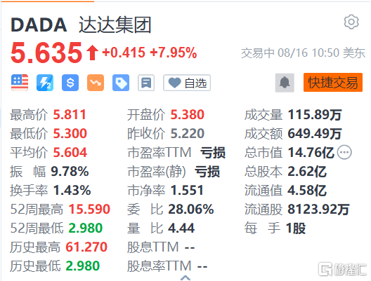达达集团(DADA.US)涨近8%,报5.635美元。达达集团2023财年第二季度业绩显示,Q2总营收达人民币28亿元,同比增长23%;非美国通用会计准则下(Non-GAAP)归属于达达集团普通股股东的净利润为人民币840万元,去年同期为亏损4亿元。