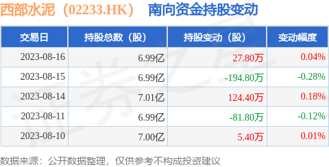 8月16日北向资金增持27.8万股西部水泥(02233.HK)。近5个交易日中,获南向资金减持的有2天,累计净减持119.0万股。近20个交易日中,获南向资金增持的有14天,累计净增持1828.2万股。截至目前,南向资金持有西部水泥(02233.HK)6.99亿股,占公司已发行普通股的12.84%。