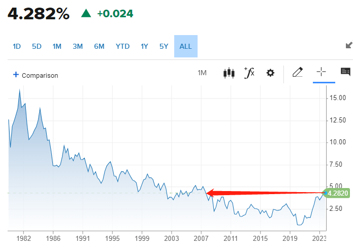 北京时间8月17日(周四)凌晨,美联储公布会议纪要,重申利率将继续维持在高水平,随后10年期美债收益率飙升,盘中突破4.281%,创下2008年6月以来最高收盘收益率。此外,30年期国债收益率收于去年10月以来新高,两年期美债收益率也飙升至5.00%。