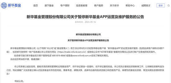 8月16日,新华基金公告称,将于8月31日起暂停移动客户端“新华基金App”的运营及维护服务,投资者可通过公司官网或微信公众号查看持仓情况并进行交易。