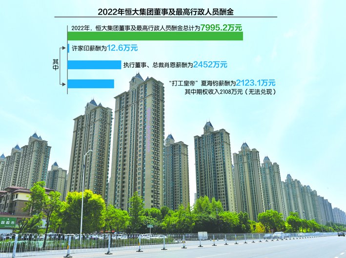 2022年,恒大集团董事及最高行政人员酬金总计为7995.2万元,其中许家印薪酬总计为12.6万元,执行董事、总裁肖恩薪酬为2452万元,而被称为“打工皇帝”的夏海钧薪酬为2123.1万元。