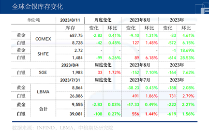 截止8月4日当周,SGE 库存增加33 吨。截止7月31日当月LBMA黄金库存减少 38.23 吨、白银增加491吨。