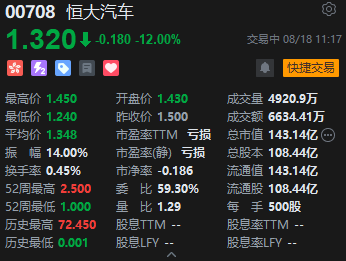 截至发稿,恒大汽车跌12%。