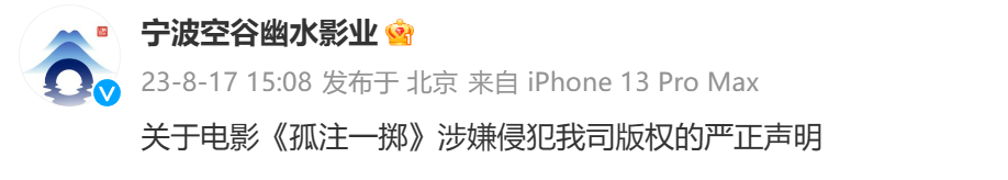 宁波空谷幽水影业表示已向国家电影局举报,并就相关侵权行为诉讼维权。