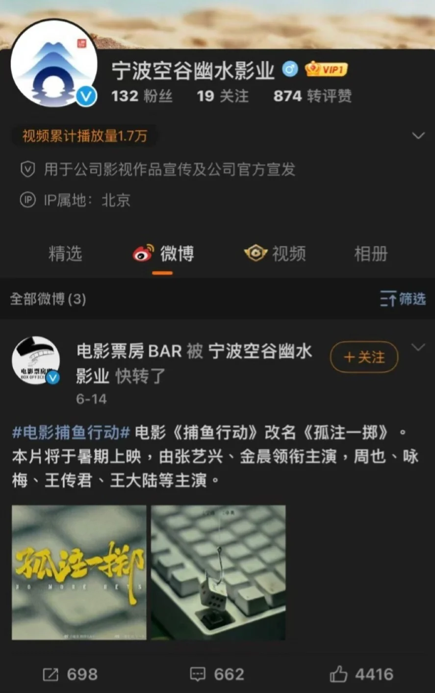 不过,有网友截图显示宁波空谷幽水影业曾快转过“电影《捕鱼行动》改名为《孤注一掷》”的信息,且宁波空谷幽水影业官博目前除已发布声明,其他信息已清空。