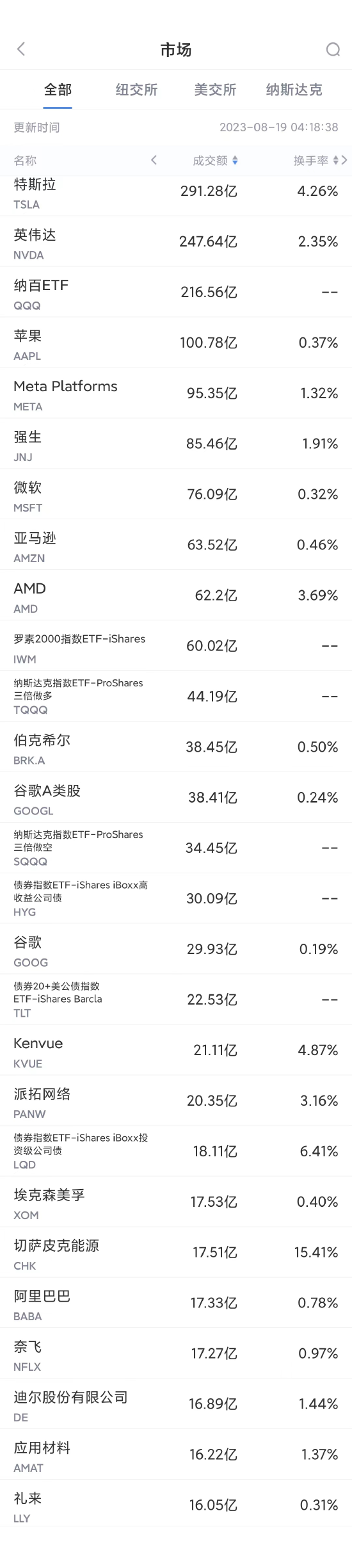 第2名英伟达收跌0.1%,成交247.64亿美元。英伟达定于下周三(8月23日)美股收盘后(北京时间8月24日凌晨)公布业绩。目前多家大行都已上调对该公司的评级和目标价。