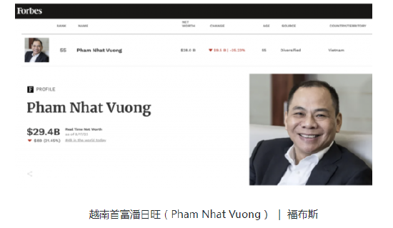 随着生意越做越大,潘日旺衣锦还乡,开始投资房地产,还涉足旅游、教育、医疗、智能手机等多个领域,从此 Vingroup 从一家泡面公司,一跃成为越南最大的综合集团。在 8 月 17 日的福布斯富豪榜中,他凭 294 亿美元(约合人民币 430 亿元)身家位列第 55 位。
