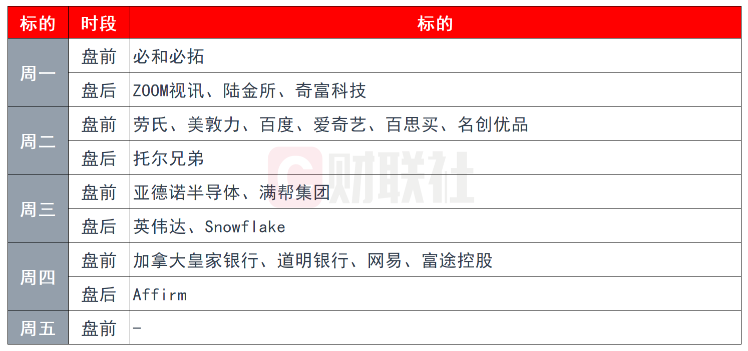 除了英伟达以外,下周还有必和必拓、Zoom视讯,以及百度、网易、富途等比较知名的美股上市公司发布财报。下周结束后,整个财报季也将逐渐归于平静。