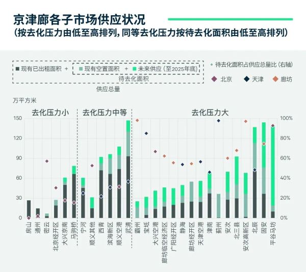 在去化压力方面,细分至每个子市场,从现有空置面积和未来供应(截至2025年底)来看,宝坻、廊坊临空经济区、大兴空港区、固安、平谷马坊、安次高新区等区域的去化压力较大。