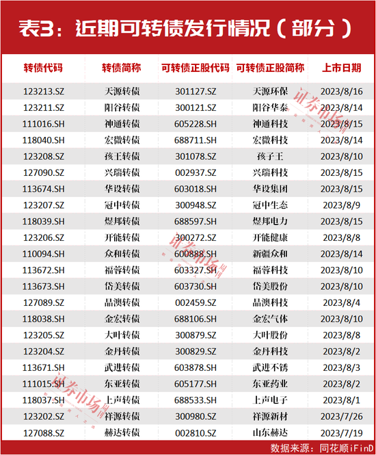 近阶段以来,可转债也正迎来密集上市。据不完全统计显示,今年以来,已有超百家公司发行可转债,而仅在8月以来,即有包括神通转债、宏微转债、孩王转债、兴瑞转债、华设转债等在内的约20只可转债上市(见表3)。