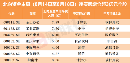 从周度(8月14日至8月18日)表现看,北向资金周净买额累计超3亿元的个股见下表。金山办公、工业富联净买入额分别为7.79亿元、7.5亿元,药明康德(维权)、重庆啤酒加仓均超5亿元。